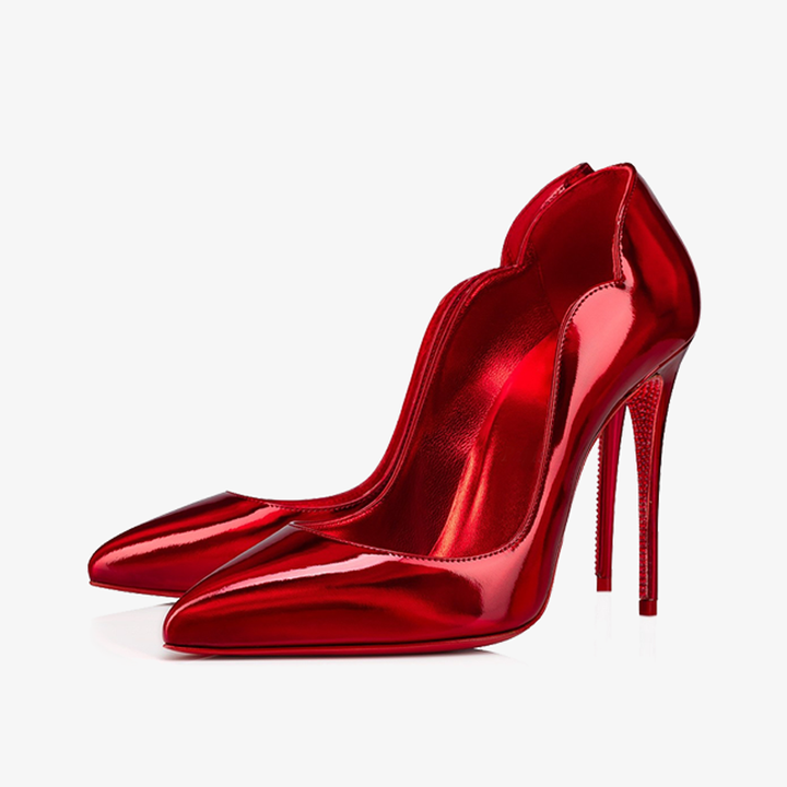 This striking pump features a low-cut vamp, a pointed toe, and V-shaped notches under the ankle. Crafted in iridescent red patent calf leather, it is set on a 100 mm heel. The sole is uniquely adorned with hand-placed red strass, adding a touch of sparkle to its bold design.