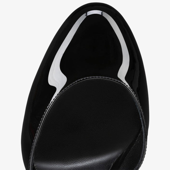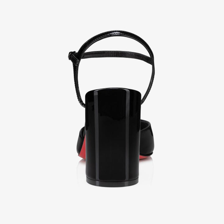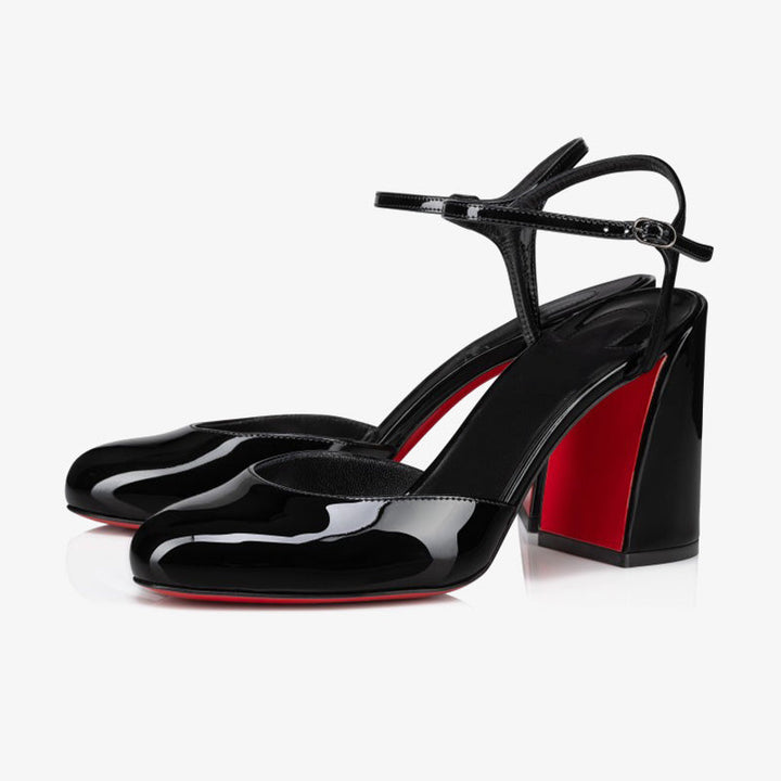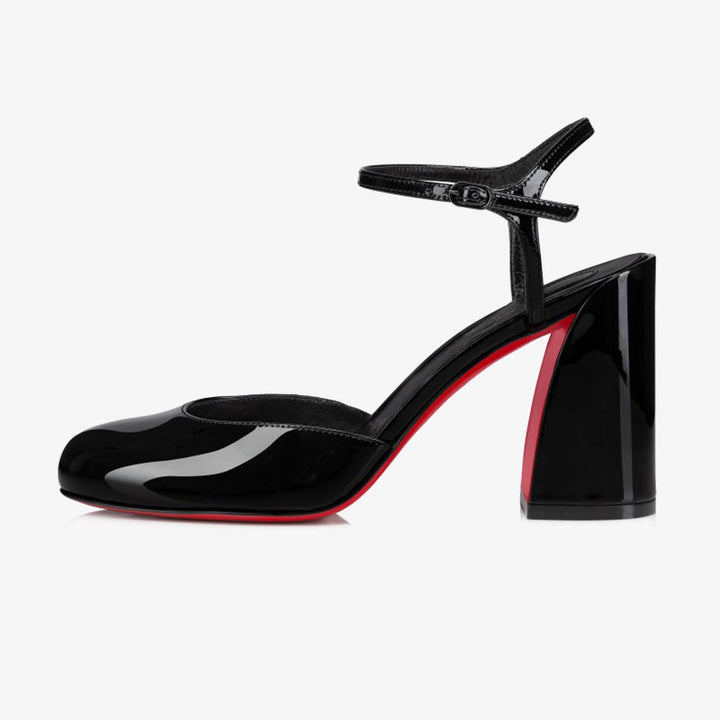 This elegant pump features a distinctive square, angled 100 mm heel that brings a modern edge to its classic silhouette. Crafted in glossy black patent leather, it showcases a rounded toe and a low-cut vamp that subtly reveals the foot. Slender ankle straps add a refined finishing touch, balancing style with support for versatile day-to-evening wear.