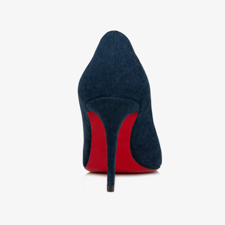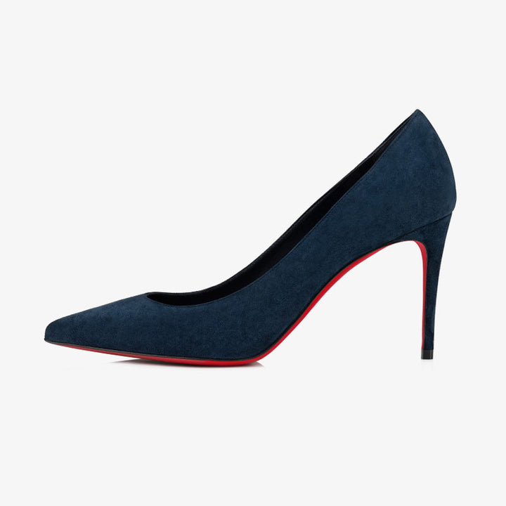 An iconic model, this pump is defined by its elegant lines and sophisticated finish. It showcases a pointed toe and a signature low-cut neckline that boldly reveals the foot. Crafted entirely from navy blue suede, this timeless silhouette is set on an 80 mm heel for a refined, versatile look.