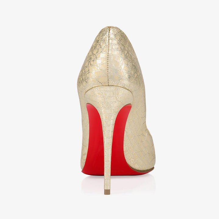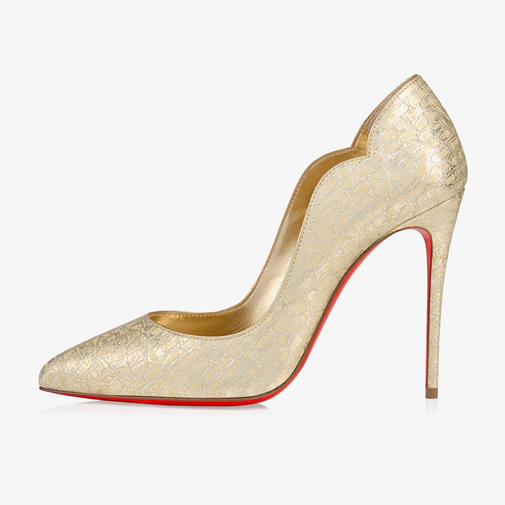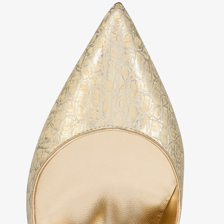 A distinctive, hot-chic shoe with a sleek silhouette, this pump stands tall on a 100 mm stiletto heel. It features a pointed toe, a graceful arch, and signature wave detailing that alluringly reveals the foot. Crafted from shiny platinum gold leather with a textured, distressed finish and matching lining, it radiates festive glamour—perfect for making a sophisticated statement at any special occasion.