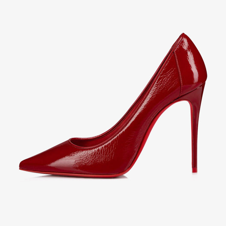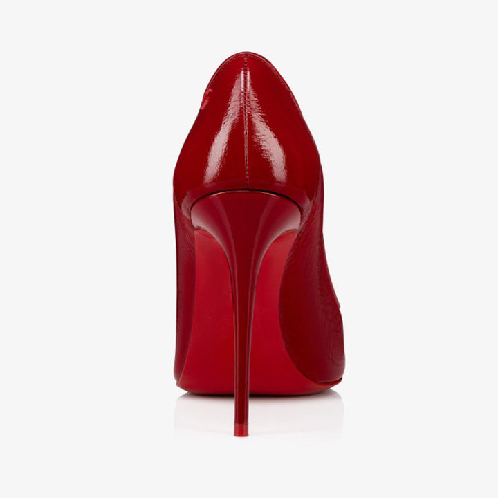 The pump is an iconic model featuring elegant lines and a striking silhouette. This refined shoe enhances the foot with an urban pointed toe and a daring low-cut vamp. Crafted entirely in red patent calf leather, it is set on a 100 mm heel and adorned with subtle details that add to its sophisticated allure. The patent leather’s flexible nature ensures better suppleness, while its naturally wrinkled texture may present slight variations between the photo and the final product.