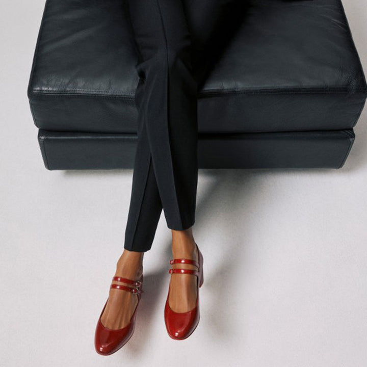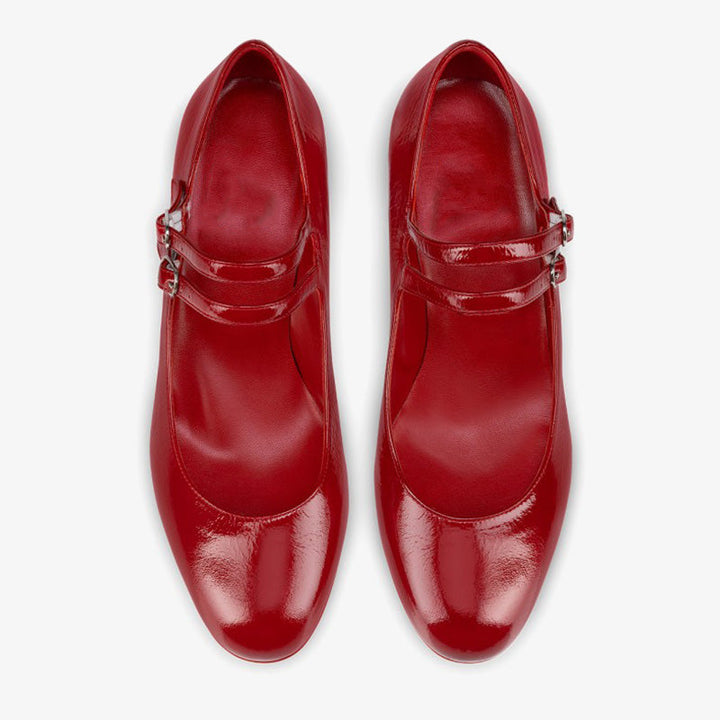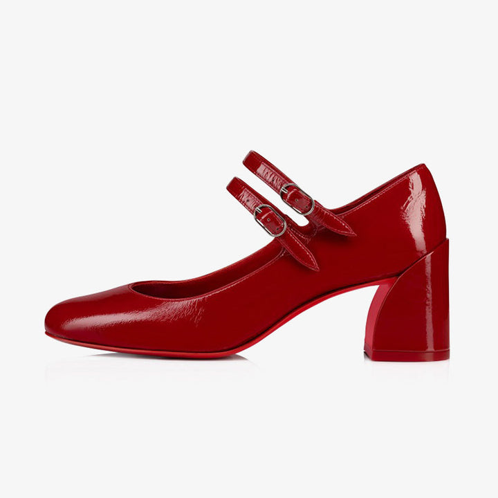 This pump is distinguished by its bevelled, wide 55mm heel. Crafted entirely from red patent leather, it features a rounded toe and an audacious signature vamp. Two slender straps with a metallic clasp delicately adorn the foot. The flexible nature of patent leather ensures suppleness, while the wrinkled effect may show slight variations between the photo and the actual product.