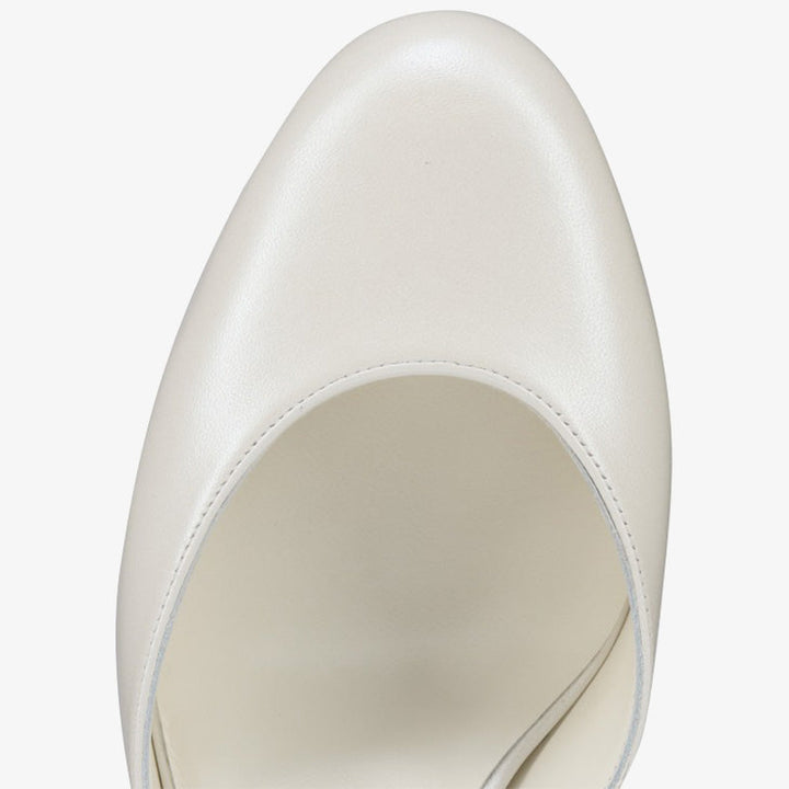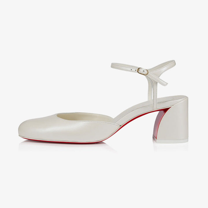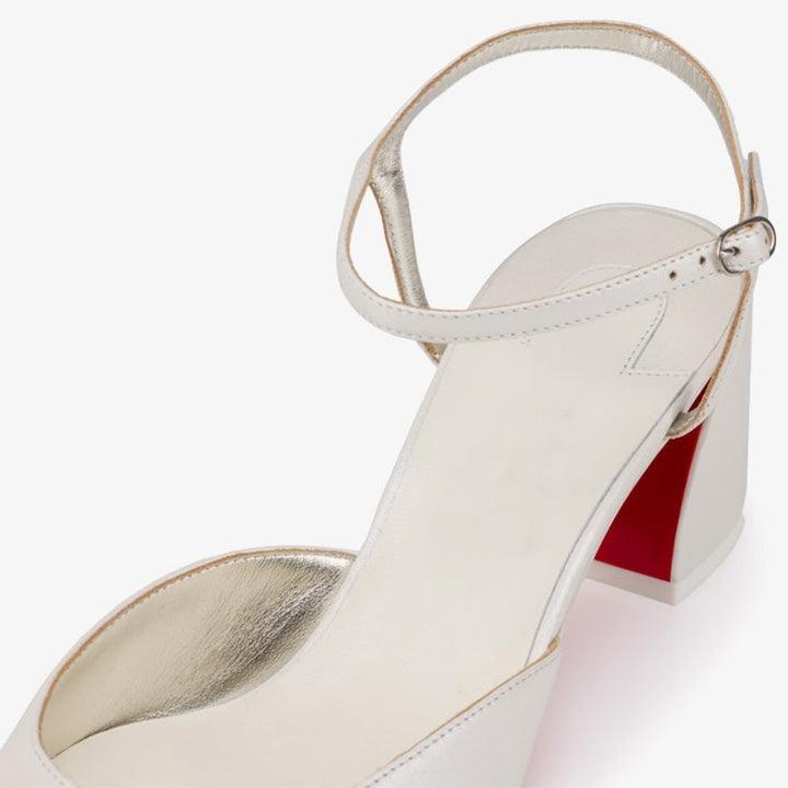 This elegant model stands out with its 55 mm beveled block heel, blending comfort with refined design. Crafted from lustrous white pearl calf leather, it features a rounded toe, a low-cut neckline that subtly reveals the foot, and delicate ankle straps that wrap gracefully for a secure fit.