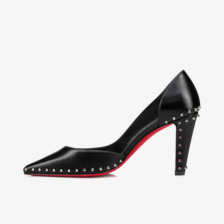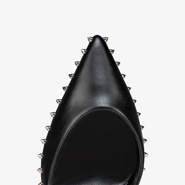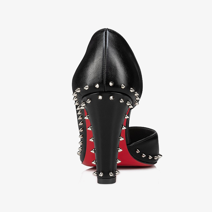 This signature half-pump design offers a bold glimpse of the foot, with mini spikes wrapping the upper and heel for an edgy touch. Set on an 100 mm Cuban heel, this model is crafted in sleek black calf leather, combining contemporary style with distinctive detailing.