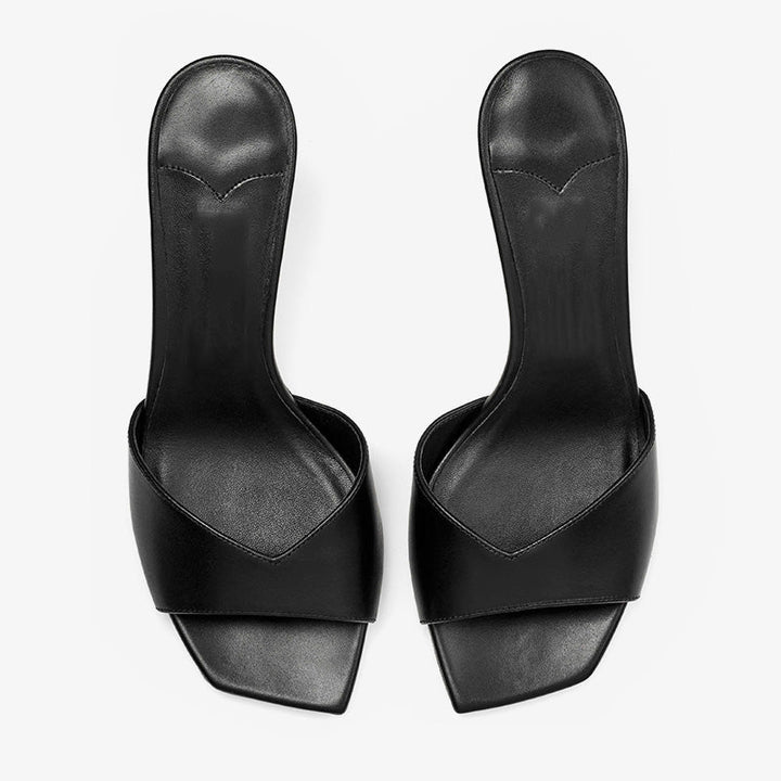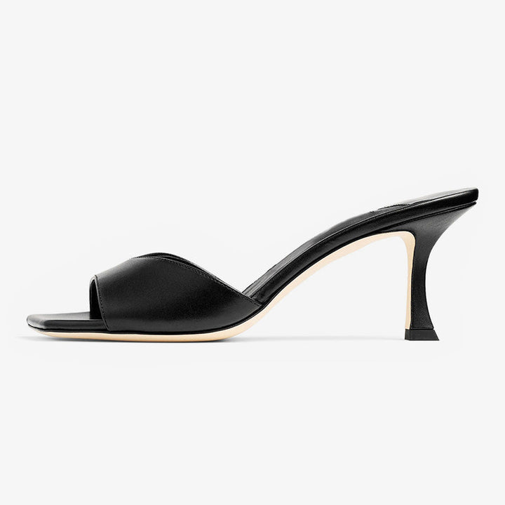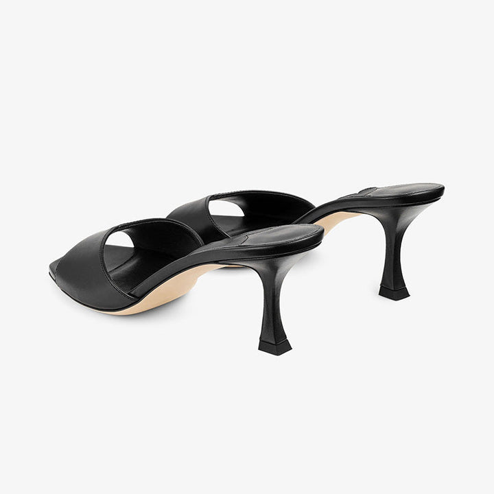 Crafted from smooth black leather, these refined sandals feature a low-cut vamp, square toe, and sculpted 70mm heel. A minimalist design with modern edge, finished with a leather lining for added comfort.