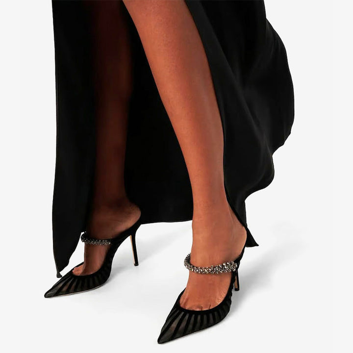 These black pumps feature a mesh fabric upper with elegant embellishments, a pointed toe, and a leather sole. Finished with a blend of fabric and leather lining for added comfort and sophistication.