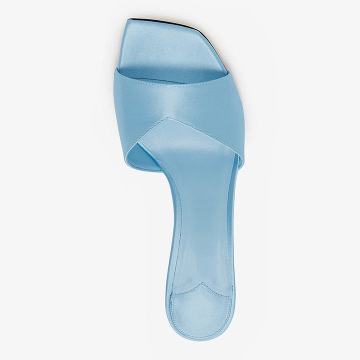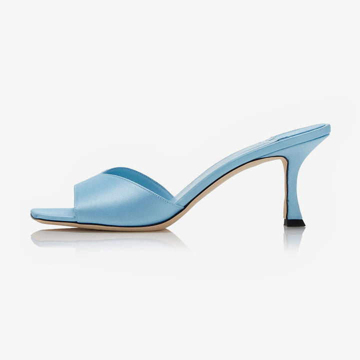Made from lustrous satin, these blue mules feature a sleek silhouette with a low-cut vamp, square toe, and sculpted 70mm heel. A refined slip-on style with modern elegance. Color:blue