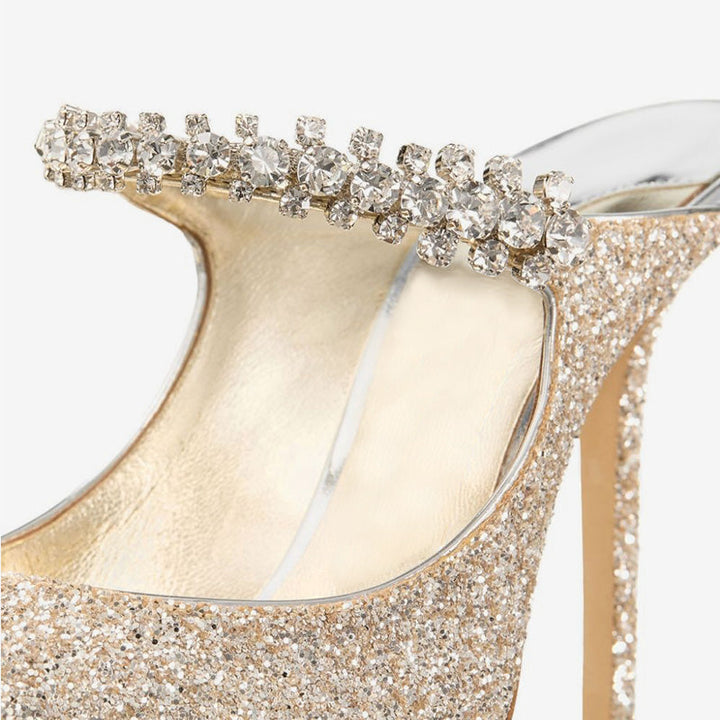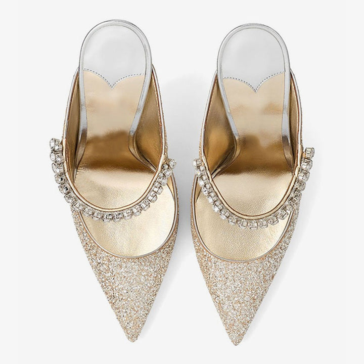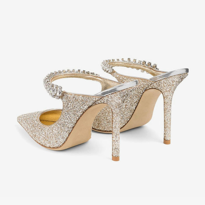 Chic and eye-catching, these Sand mules feature glitter detailing, a pointed toe, and a crystal-embellished ankle strap. Designed with a slip-on style, leather lining and sole, and a 100mm stiletto heel for a dazzling finish.