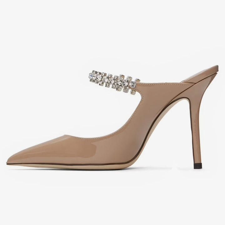 Crafted from glossy patent leather, these pointed-toe heels feature sparkling crystal embellishments, a cushioned insole, smooth leather lining, and a 100mm wrapped heel for an elevated finish.