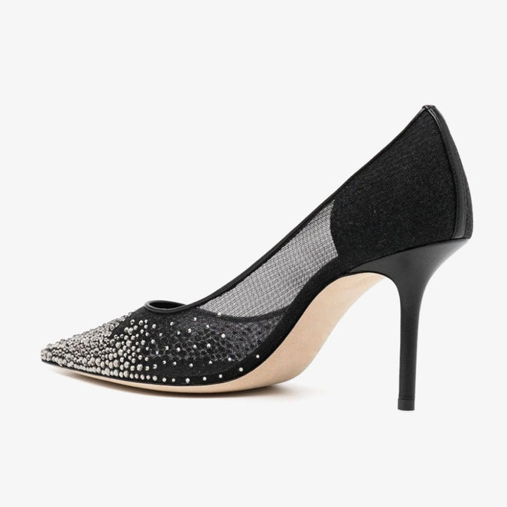 Delicately crafted with sheer mesh and adorned with sparkling crystals, these pumps exude refined glamour. The pointed-toe silhouette and sleek leather construction create an effortlessly elegant look, perfect for elevating any ensemble with sophistication.The heel height of this pair is 80mm.