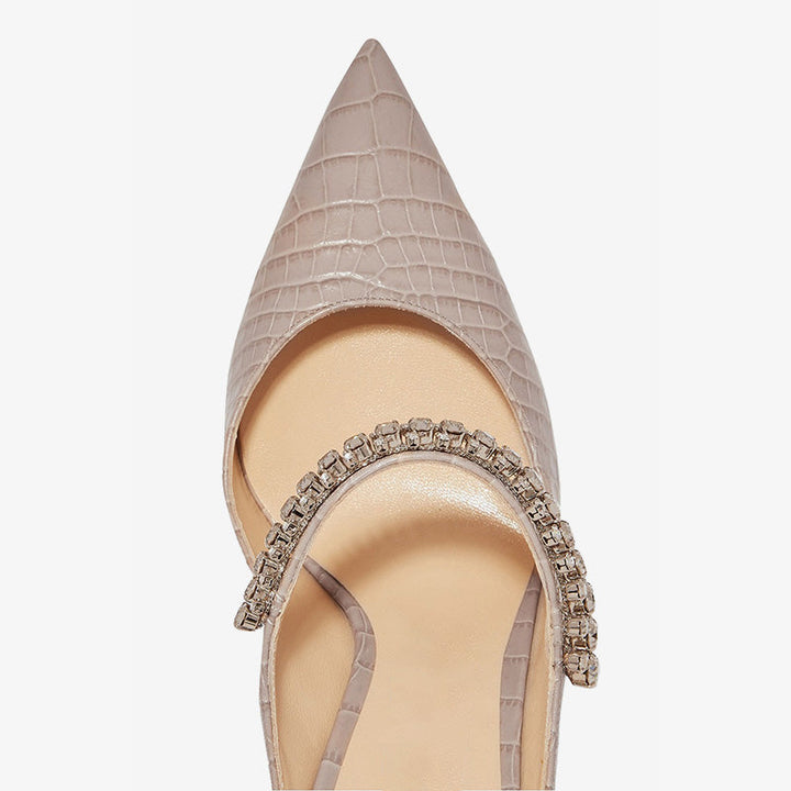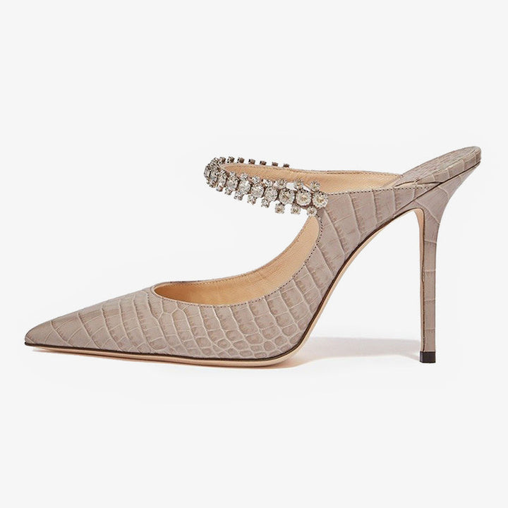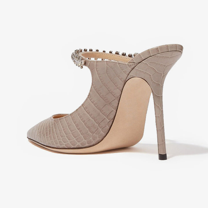 These pointed-toe mules are crafted from croc-embossed leather and feature a crystal-embellished strap. Finished with a leather lining and sole for a polished, luxurious look.
