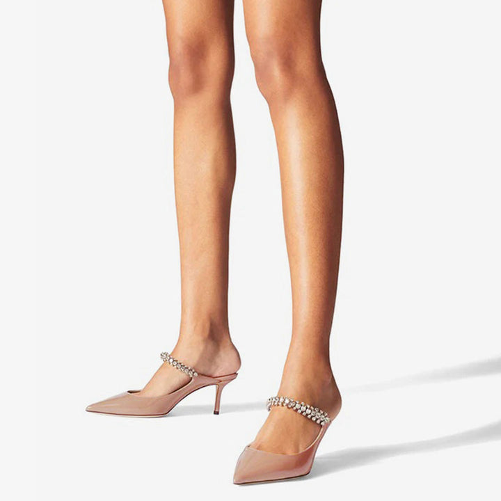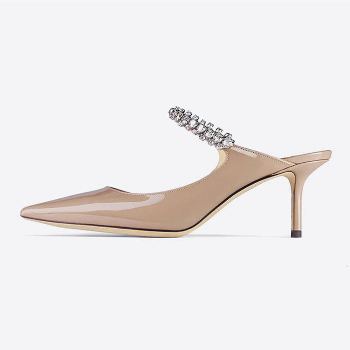 A perfect blend of modern style and timeless elegance, these nude patent leather mules are designed to make a statement. The sleek pointed toe and crystal-adorned strap add a touch of refined glamour, while the stiletto heel ensures a graceful silhouette. Effortlessly chic, they complement both daytime sophistication and evening allure.The heel height of this pair is 65mm.