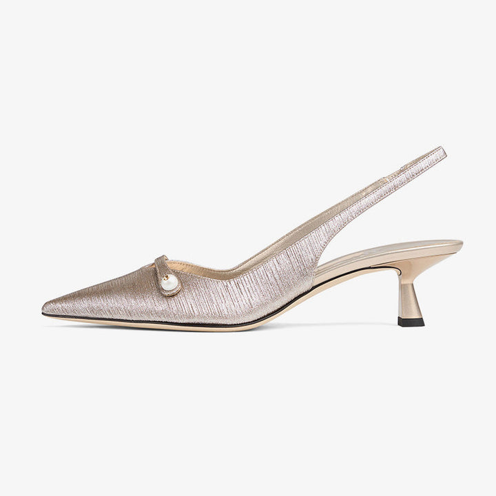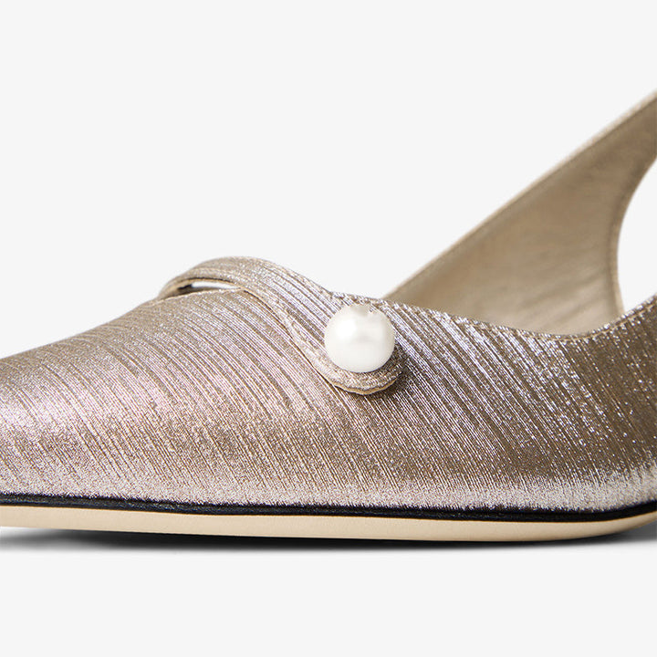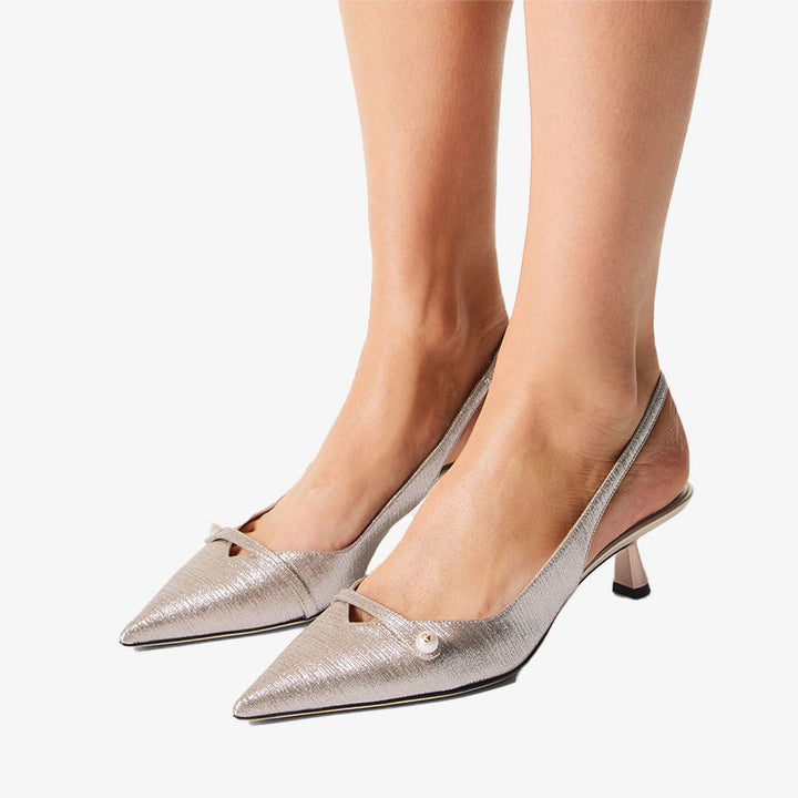 These glamorous slingback pumps feature a glitter fabric upper and a pointed-toe silhouette, elevated by a graphic kick heel. The deep V design is accentuated by a delicate elasticated strap adorned with pearls, adding a touch of sophistication to this modern classic.The heel height of this pair is 60mm.