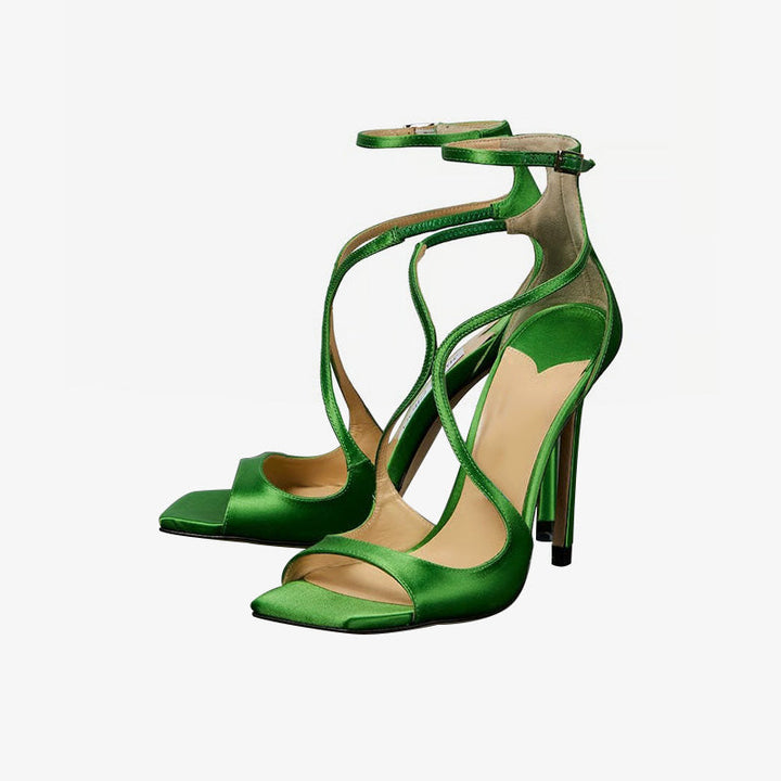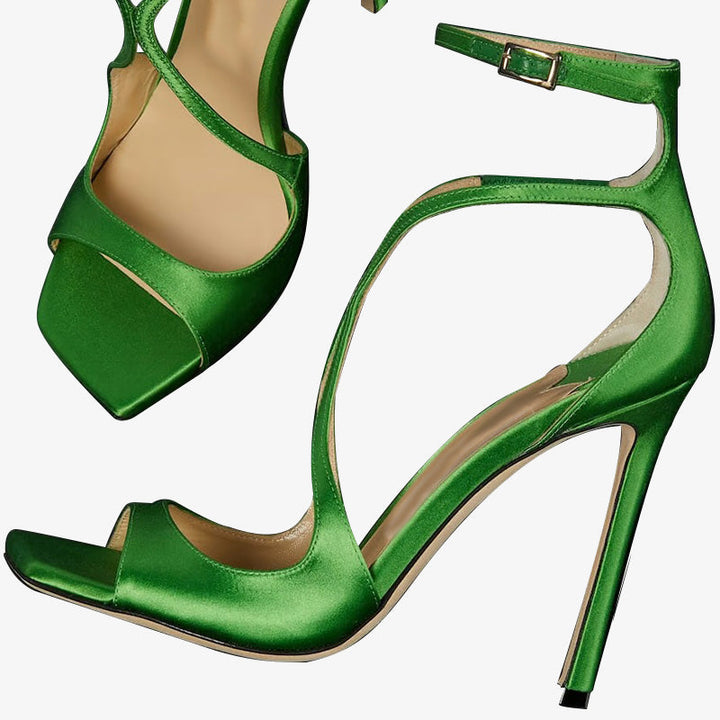 Crafted in green satin, these elegant heeled sandals feature a square open toe, slim straps, and a buckle-fastening ankle strap. Set on a 110mm heelColor:green
