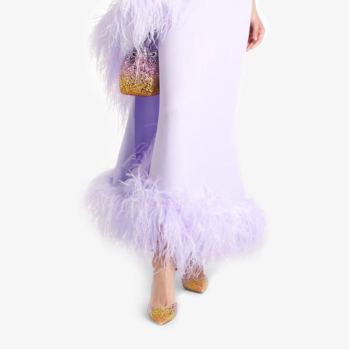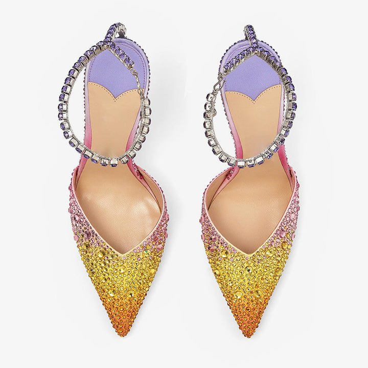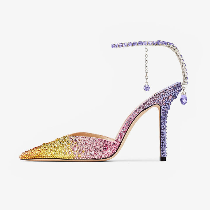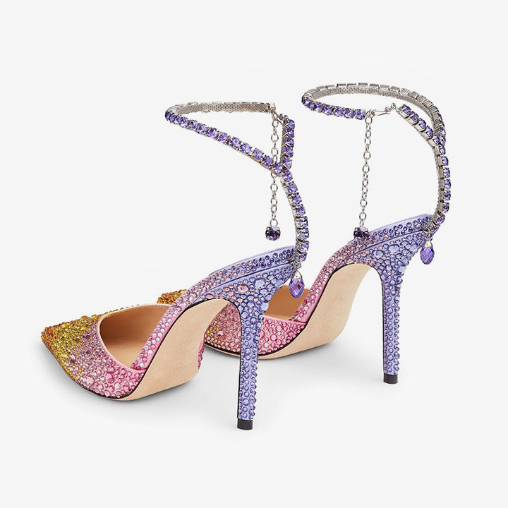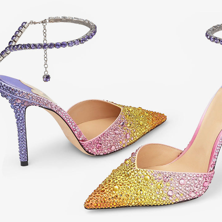 These calf leather pumps feature a stunning blend of pink and gold tones, fully embellished with hotfix crystals and a hand-finished crystal anklet with a delicate drop crystal at the back. With a pointed toe and 100mm stiletto heel, the adjustable clasp ensures a secure and elegant fit, beautifully enhancing the silhouette.