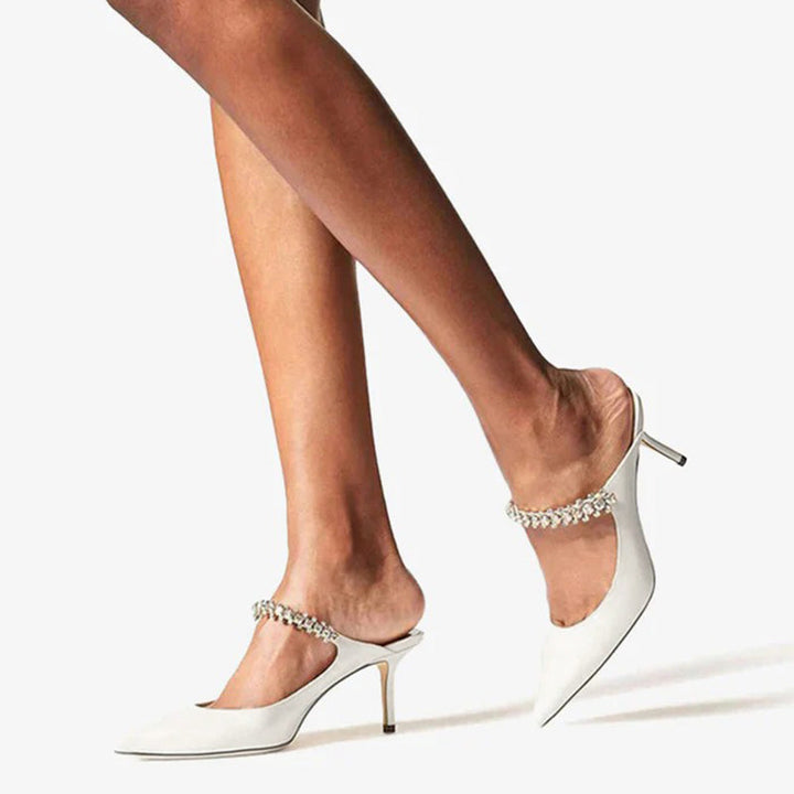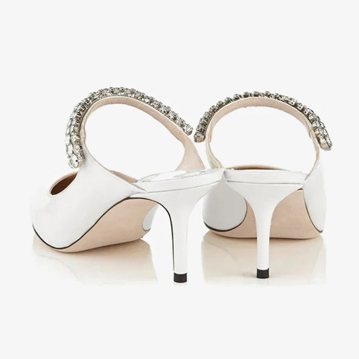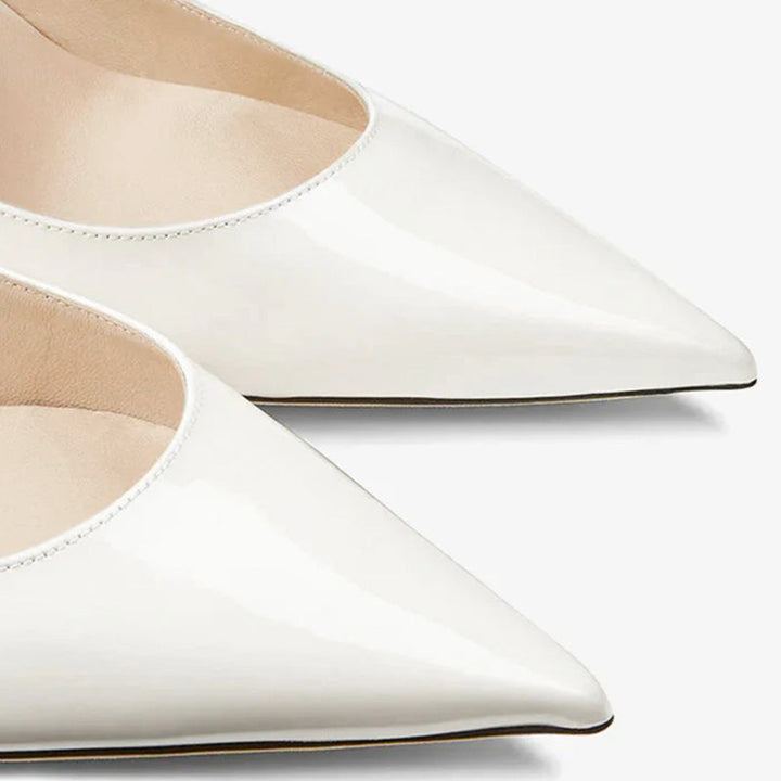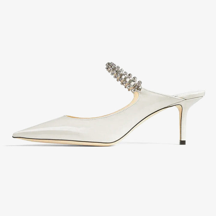 These glamorous pumps are crafted from patent leather with a sleek slip-on design and a crystal-embellished strap across the foot. The pointed toe and slim 65mm heel create a strong, elegant silhouette, while the leather lining and sole ensure comfort and sophistication.