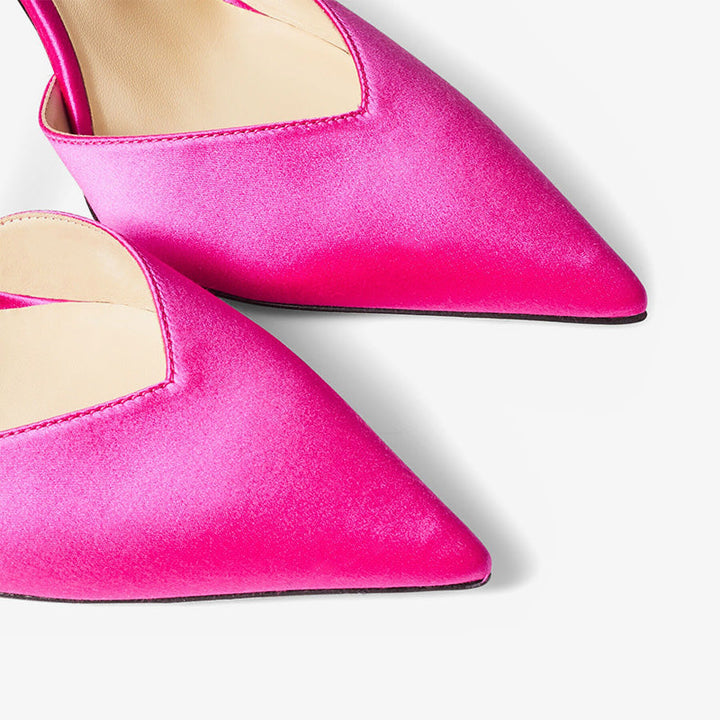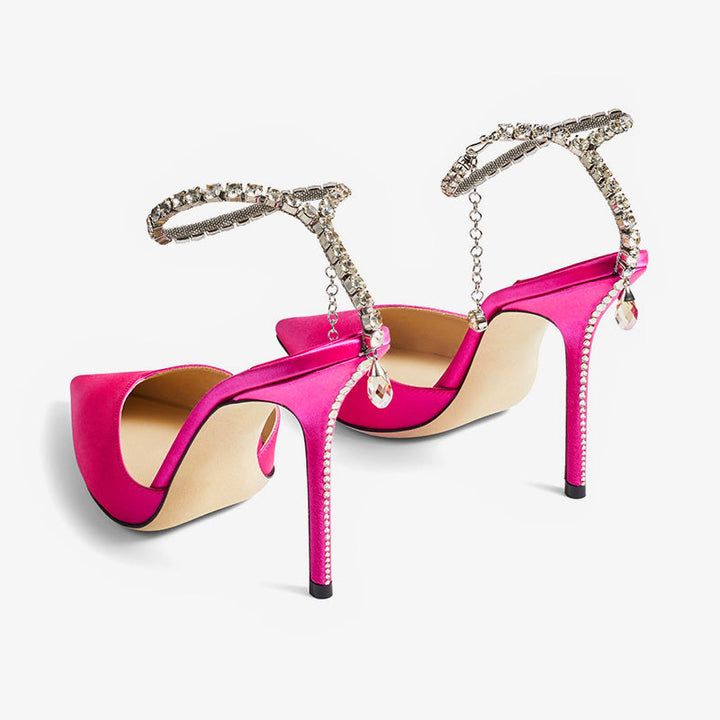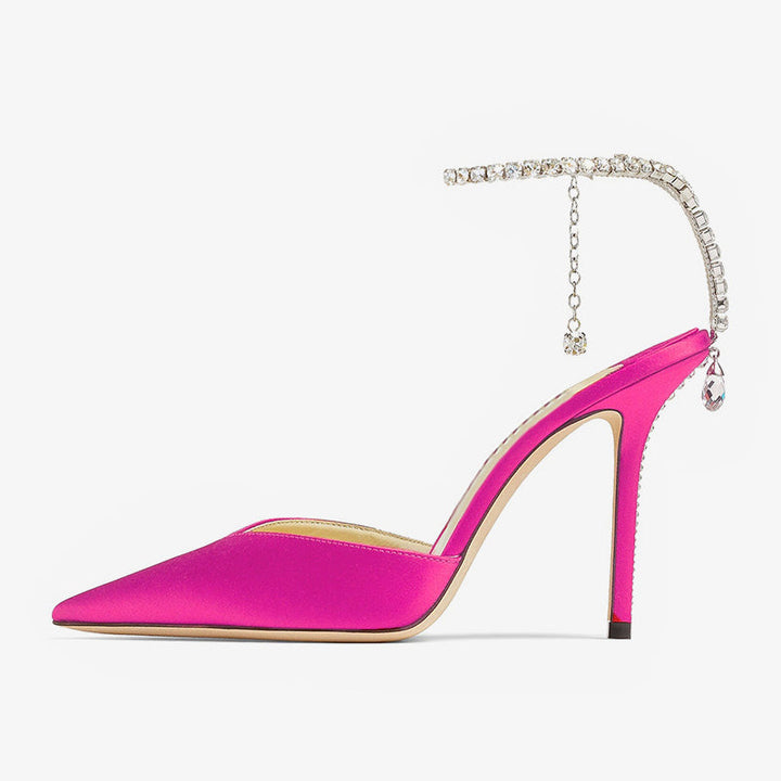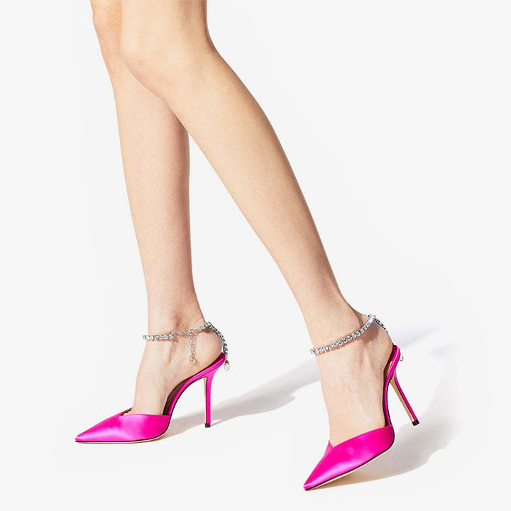 These striking pink satin pumps feature a delicate crystal chain embellishment that cascades down the heel. Designed with a pointed toe and a slim 100mm stiletto heel, they bring elegance and glamour to any look.