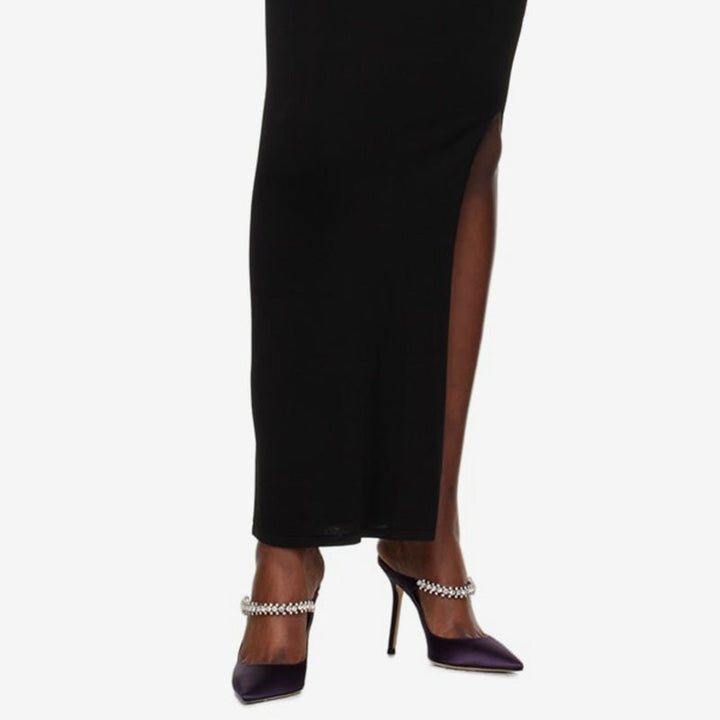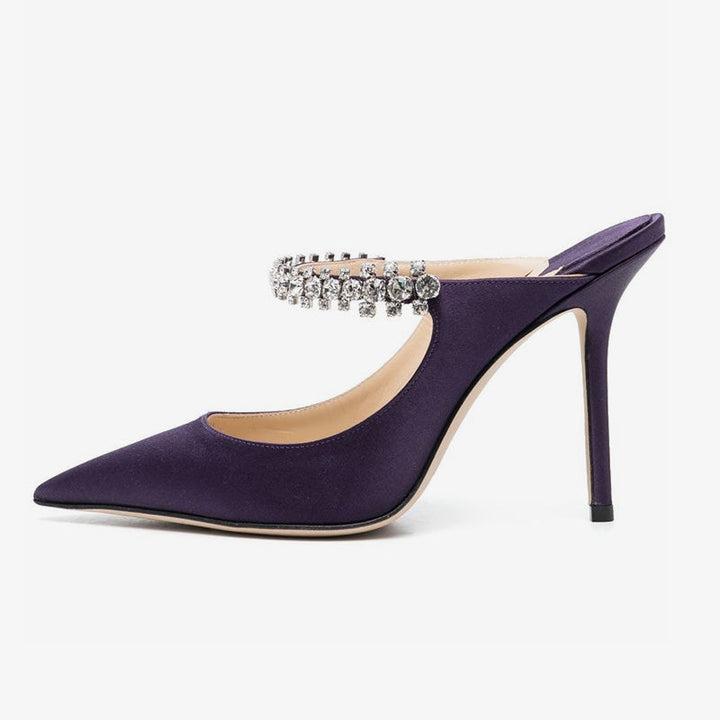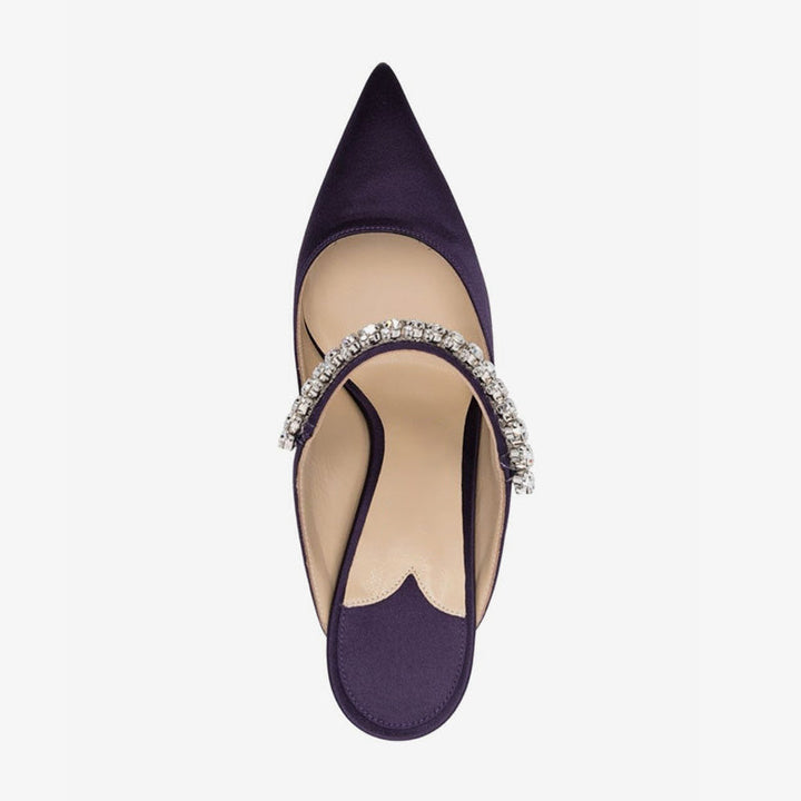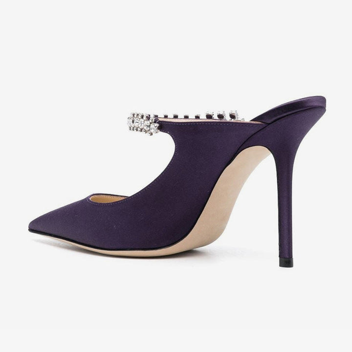 Elevate your style with these stunning purple pumps, crafted from luxurious calf leather with a satin finish. Featuring a pointed toe and adorned with sparkling crystal embellishments, they boast a sleek 100mm high stiletto heel. Perfect for adding a touch of glamour to any outfit.
