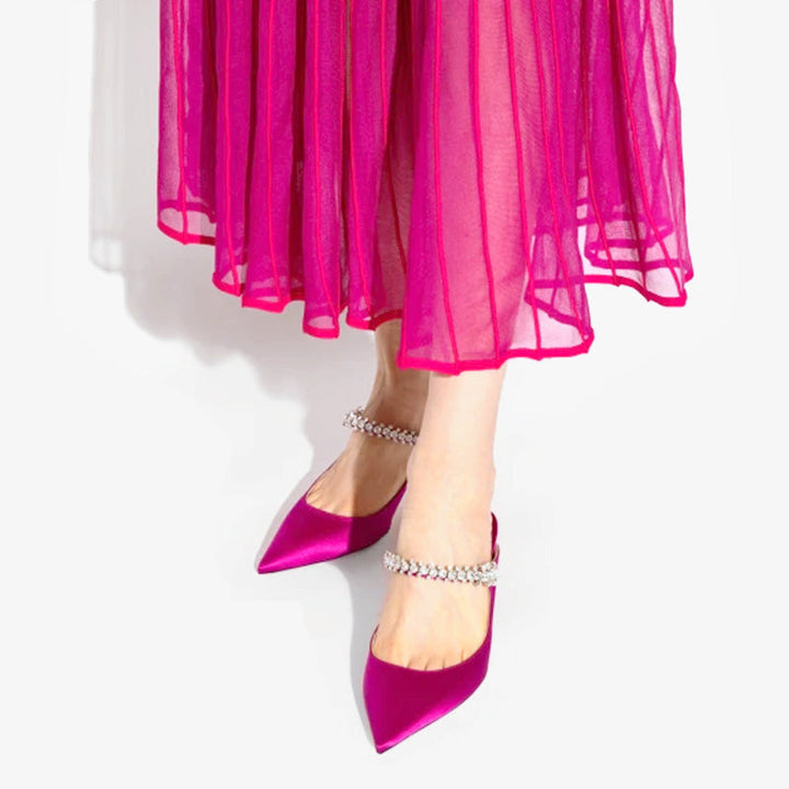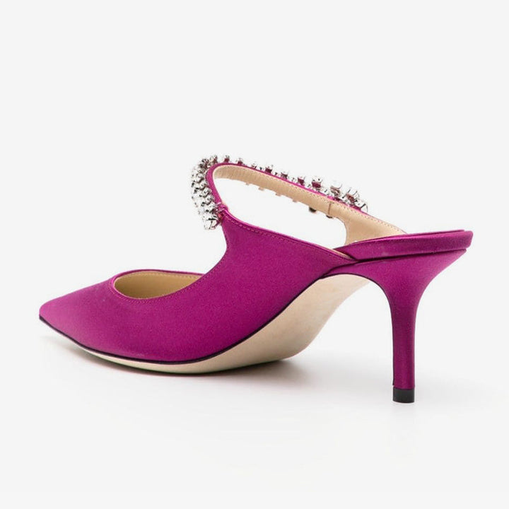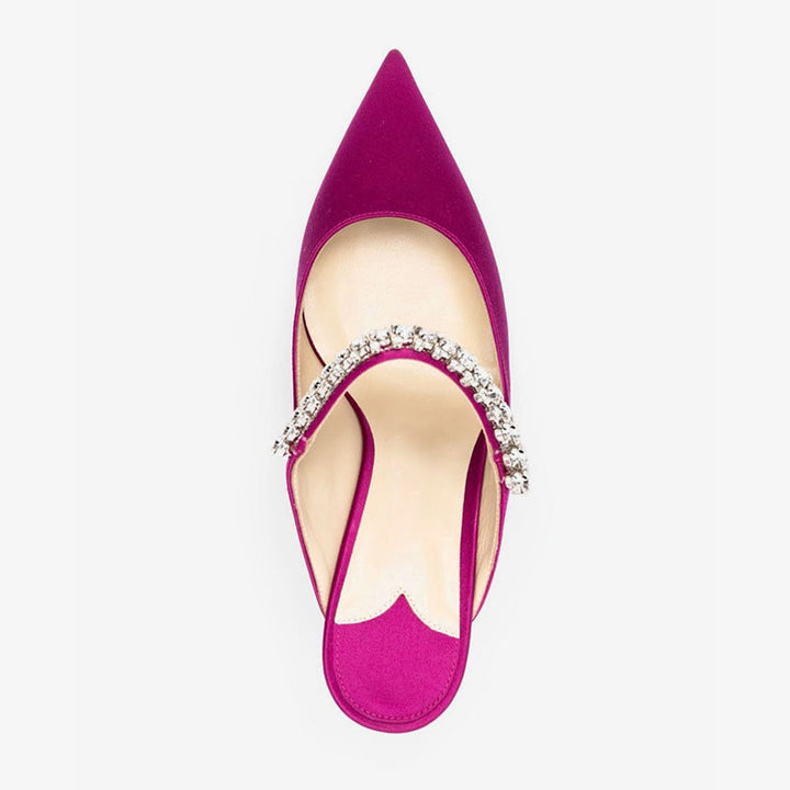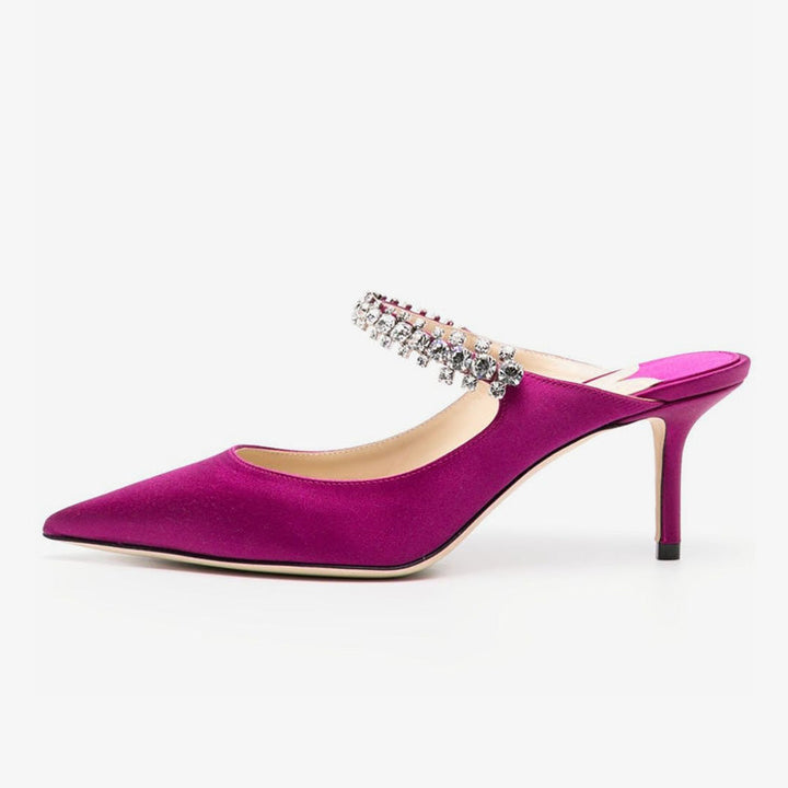 Refined and radiant, these purple satin mules feature a pointed toe and a crystal-embellished strap that adds a jewelry-like touch. Set on a 65mm stiletto heel with leather lining and sole, this slip-on style brings effortless elegance.?