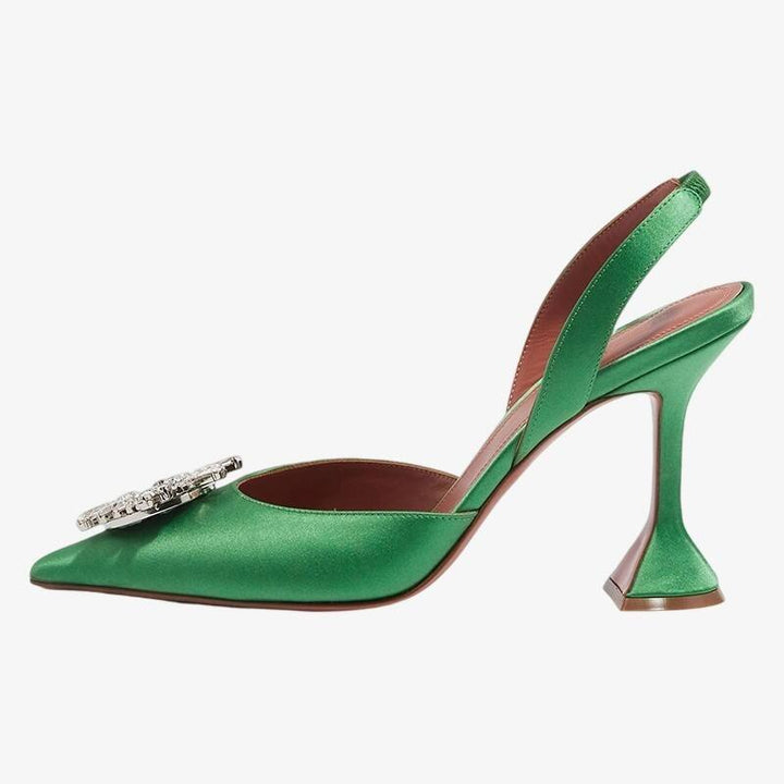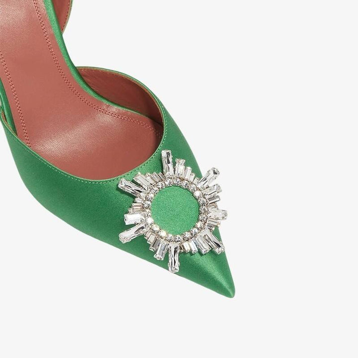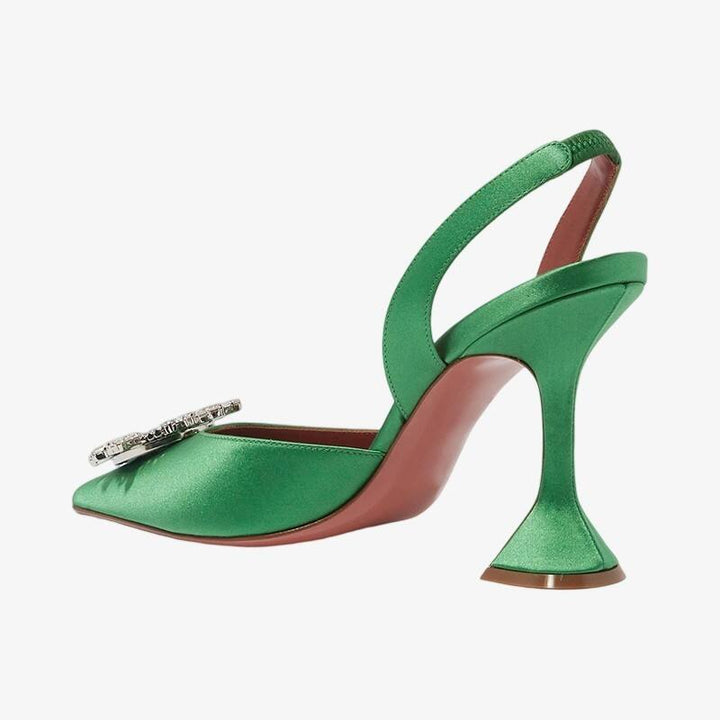 Step into a moonlit grove with these mystical dark green satin slingbacks, where dewdrop crystals glimmer like forest secrets against deep emerald foliage. The 95mm structured heel lifts you with woodland grace, while the leather construction grounds you in luxurious comfort.