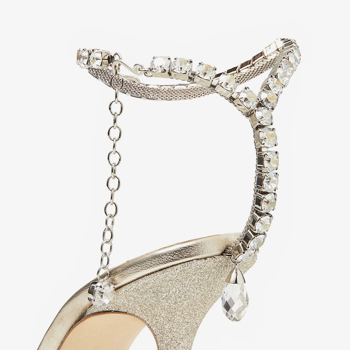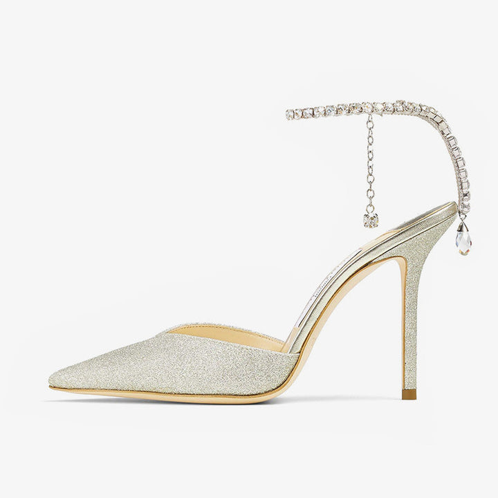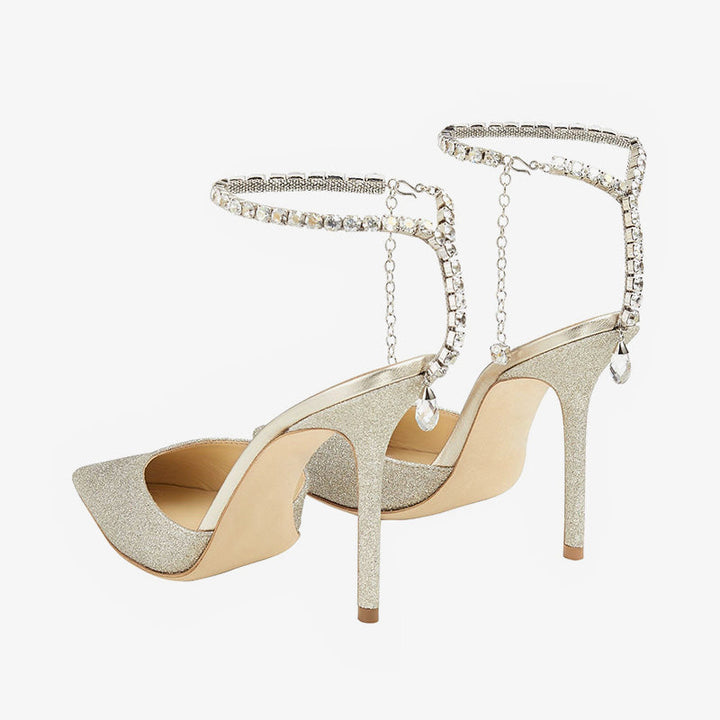 These stunning silver glitter pumps are adorned with a delicate crystal chain that gently decorates the ankle, featuring a single crystal drop at the back. Set on a 100mm stiletto heel, these pointed-toe pumps combine elegance and sparkle, making them a perfect choice for bridal or statement occasions.