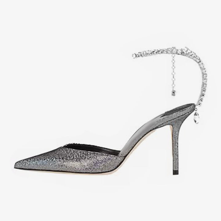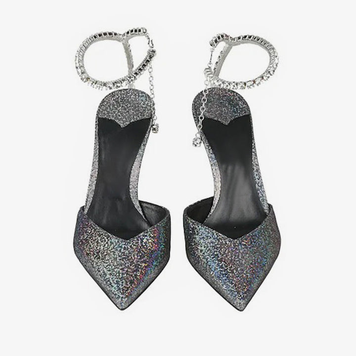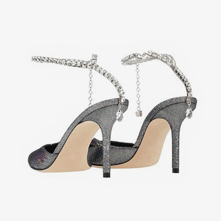 Elegant silver sandals with a slender stiletto heel, designed for a sleek and sophisticated look. Perfect for formal occasions or nights out, these heels combine style and grace in a minimalist design.