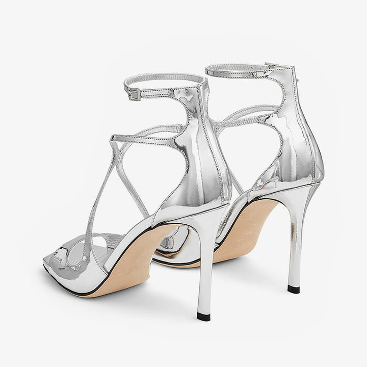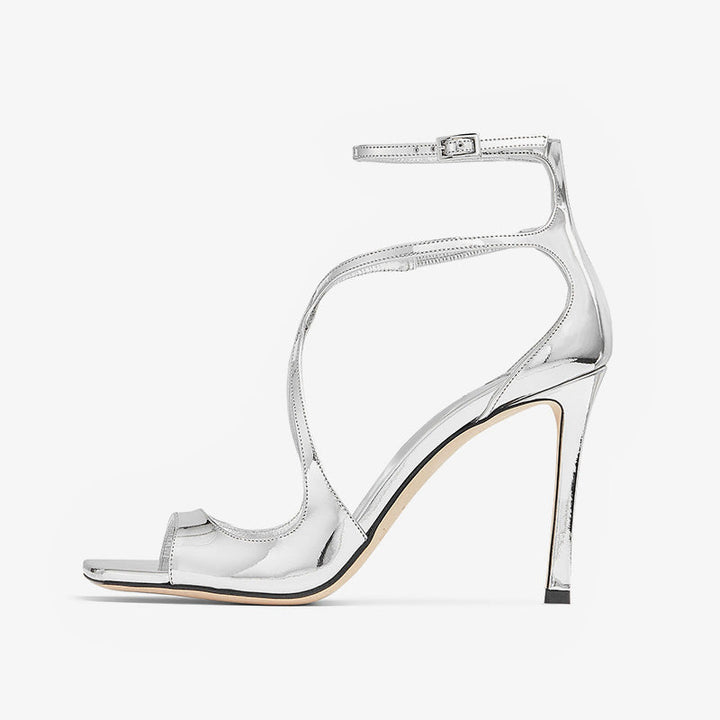 Elegant and modern, these silver leather sandals feature sculpted double straps designed to elongate the leg and a refined square toe. Finished with a slim 95mm heel, elastic inserts for comfort, and a hand-applied sole, each pair is a testament to meticulous craftsmanship.Color:silver