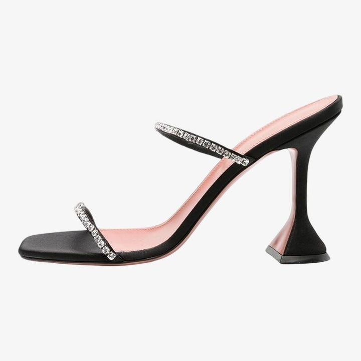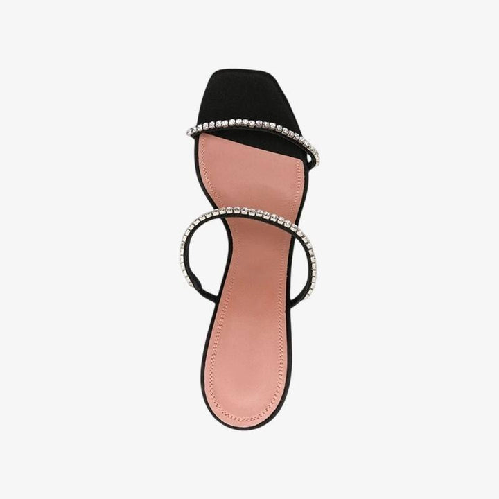 Elevate your evening look with these luxurious black satin mules, featuring slender crystal-embellished crossover straps and a signature 85mm fluted heel. The square open toe adds modern flair, while the calf leather sole ensures comfort and durability.