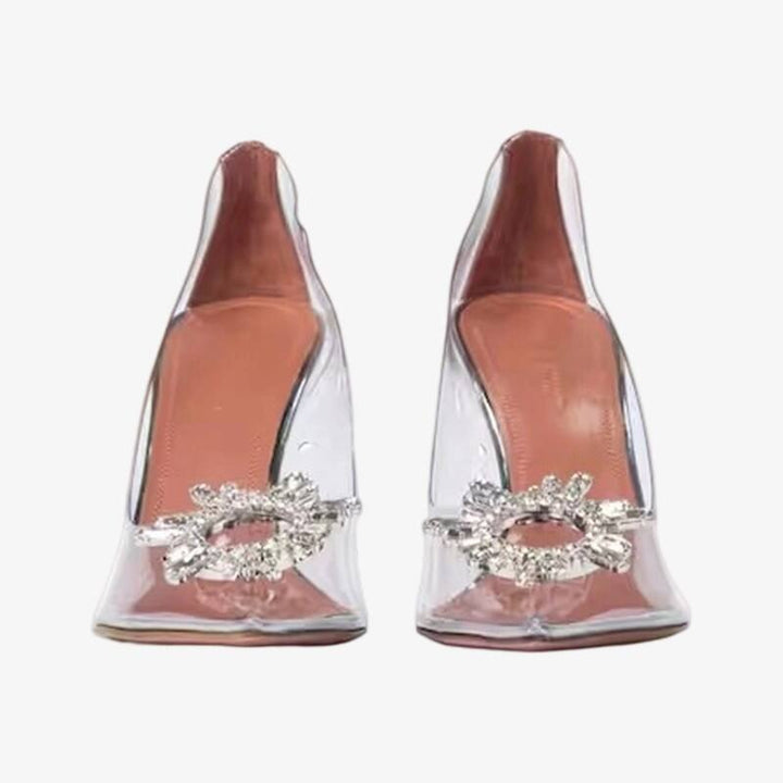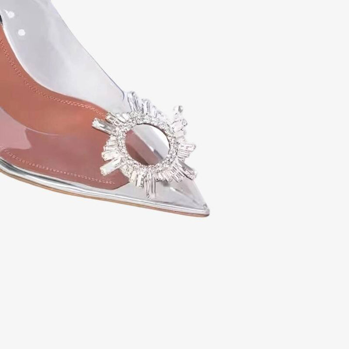 Create an illusion of floating in these elegant transparent PVC pumps, featuring a dazzling crystal sunray embellishment at the pointed toe and a dramatic 95mm heel. The barely-there silhouette offers a modern statement, elevated by the substantial yet sleek heel, while the calf leather lining and sole ensure comfort and wearability. Perfect for making a striking entrance at your next special event.