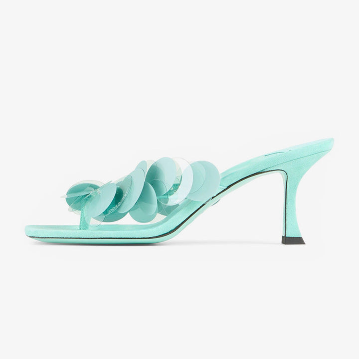 These teal suede mule sandals feature metallic disc sequins for a retro-chic touch. Designed with a square toe, sculpted 70mm heel, and leather lining, they combine vintage-inspired glamour with modern elegance.
