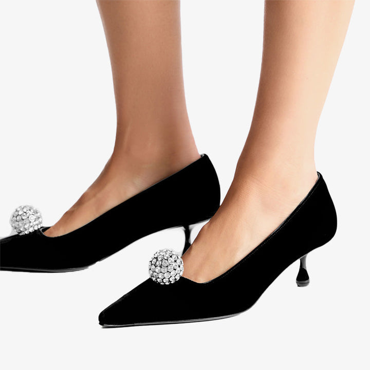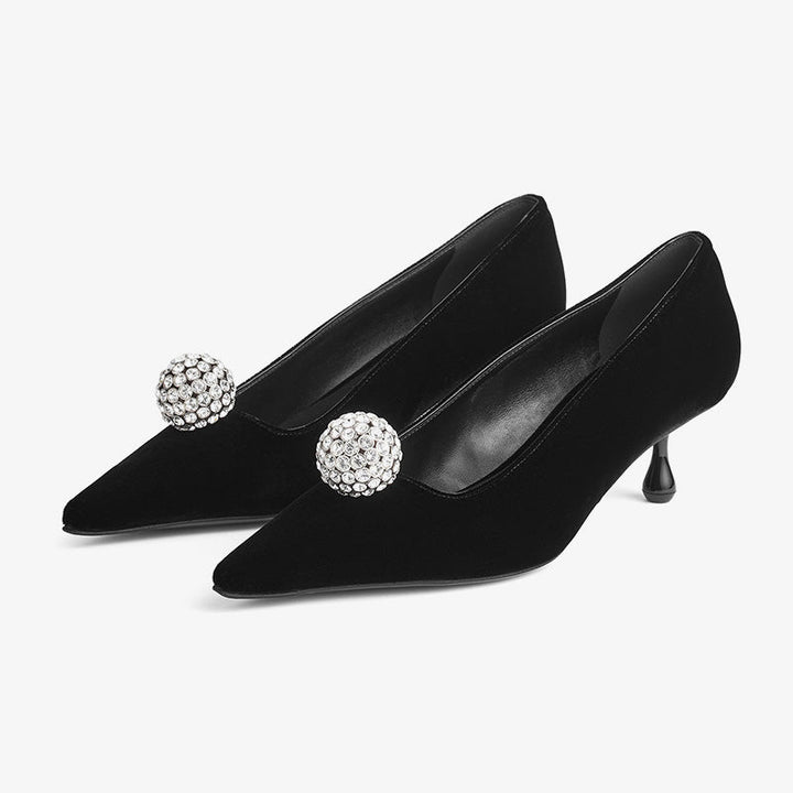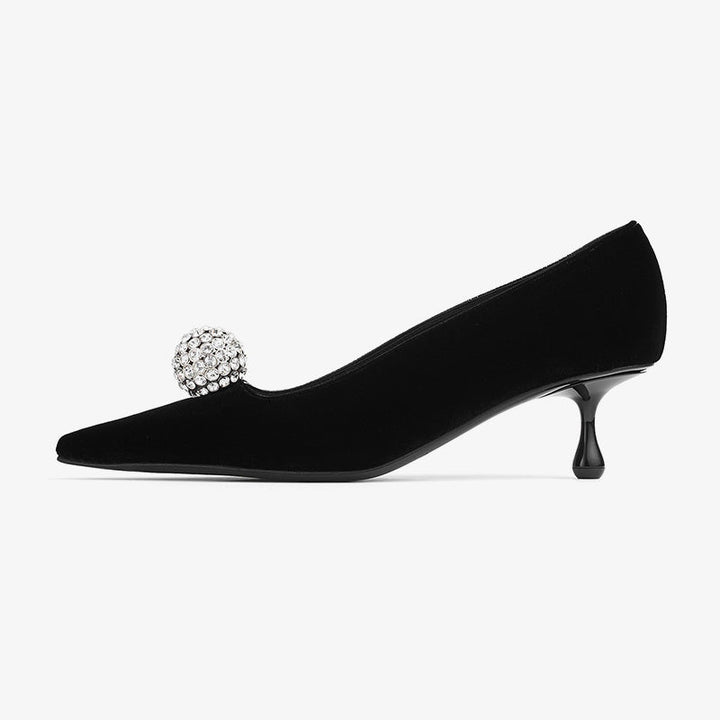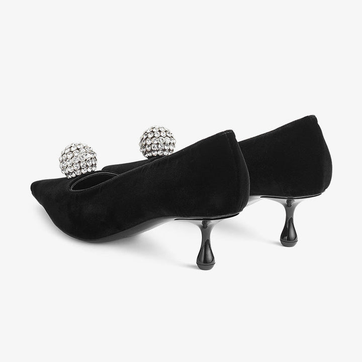 A striking fusion of elegance and modern design, these velvet pumps feature a sculptural drop heel and a dazzling crystal-embellished orb. The square-cut vamp and pointed toe create a refined silhouette, making them a bold yet sophisticated choice for any occasion. Luxuriously crafted with leather lining and a durable sole, they bring both glamour and comfort to every step.The heel height of this pair is 60mm.